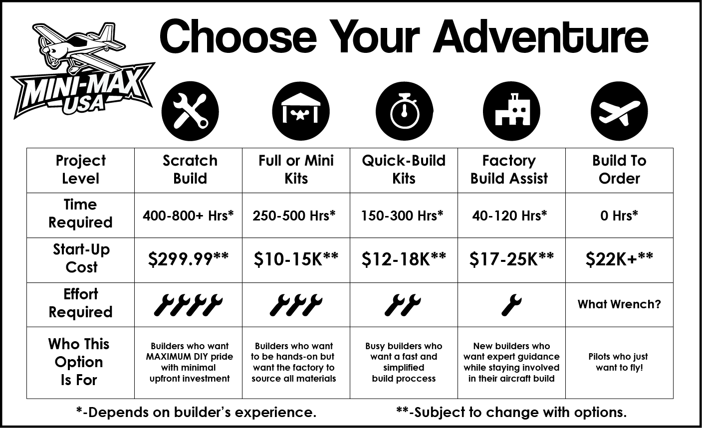 Base Kit Build Hours* | 250–300 | 300–350 | 325–400 | 325–400 | 325–400 | 325–400 |
