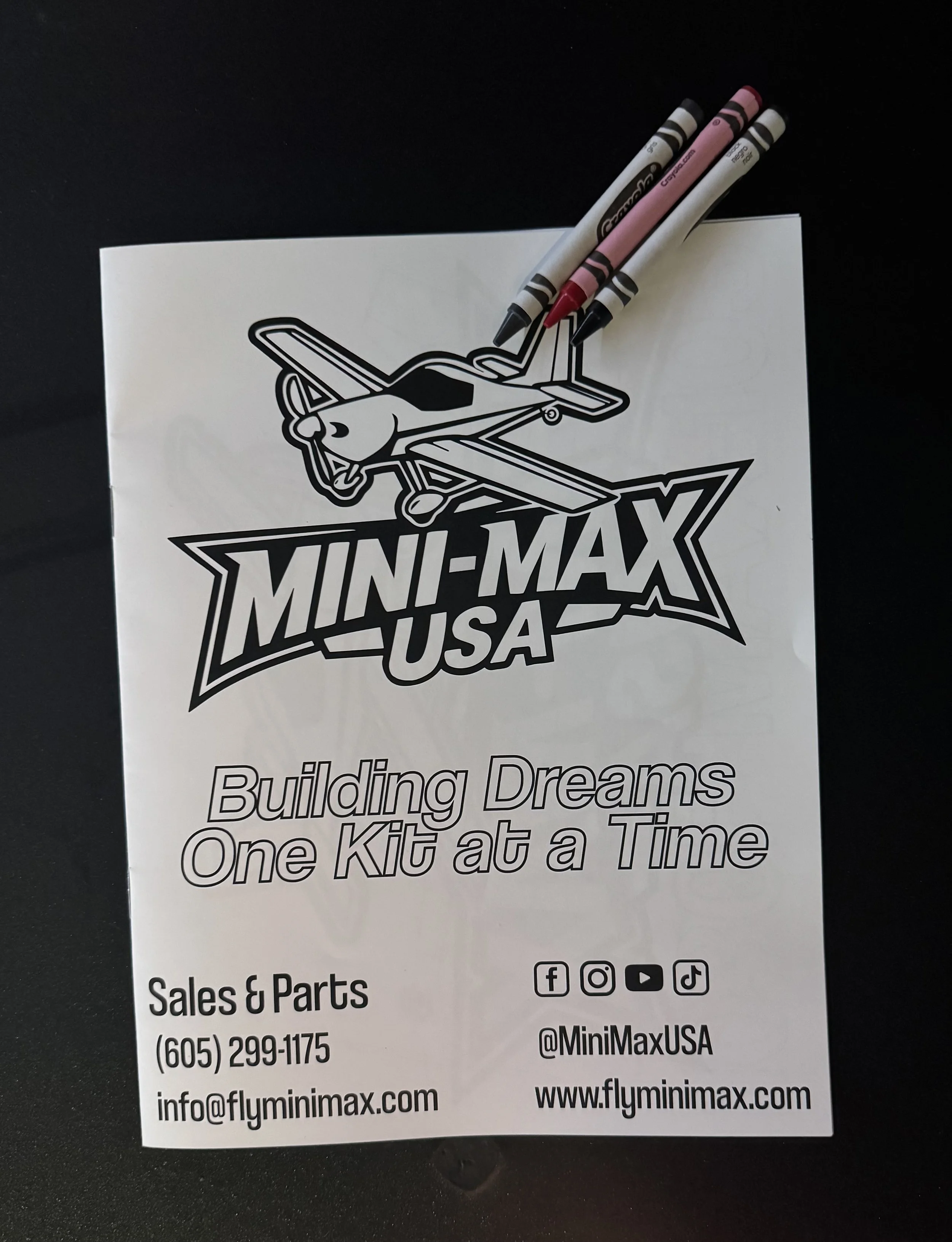 Take a break from building—or flying—and tap into your inner artist with the Mini-MAX Coloring Book. Whether you're a young aviation enthusiast or just young at heart, this book is packed with detailed line drawings of every Mini-MAX aircraft model in our lineup. From the iconic high-wing Hi-MAX 1700R to the sleek, mid-wing 1650R Eros, each page invites you to explore the spirit of flight in a whole new way.